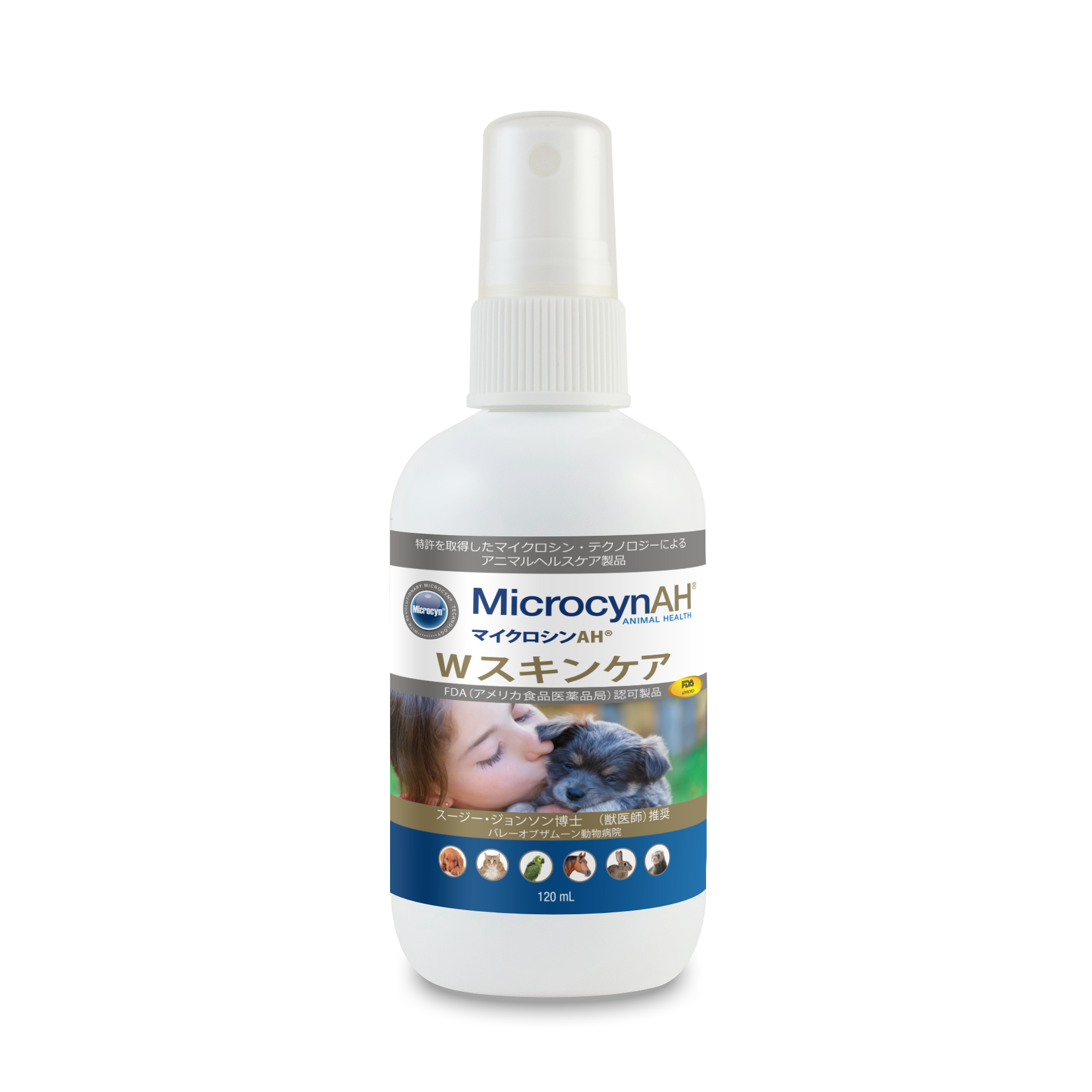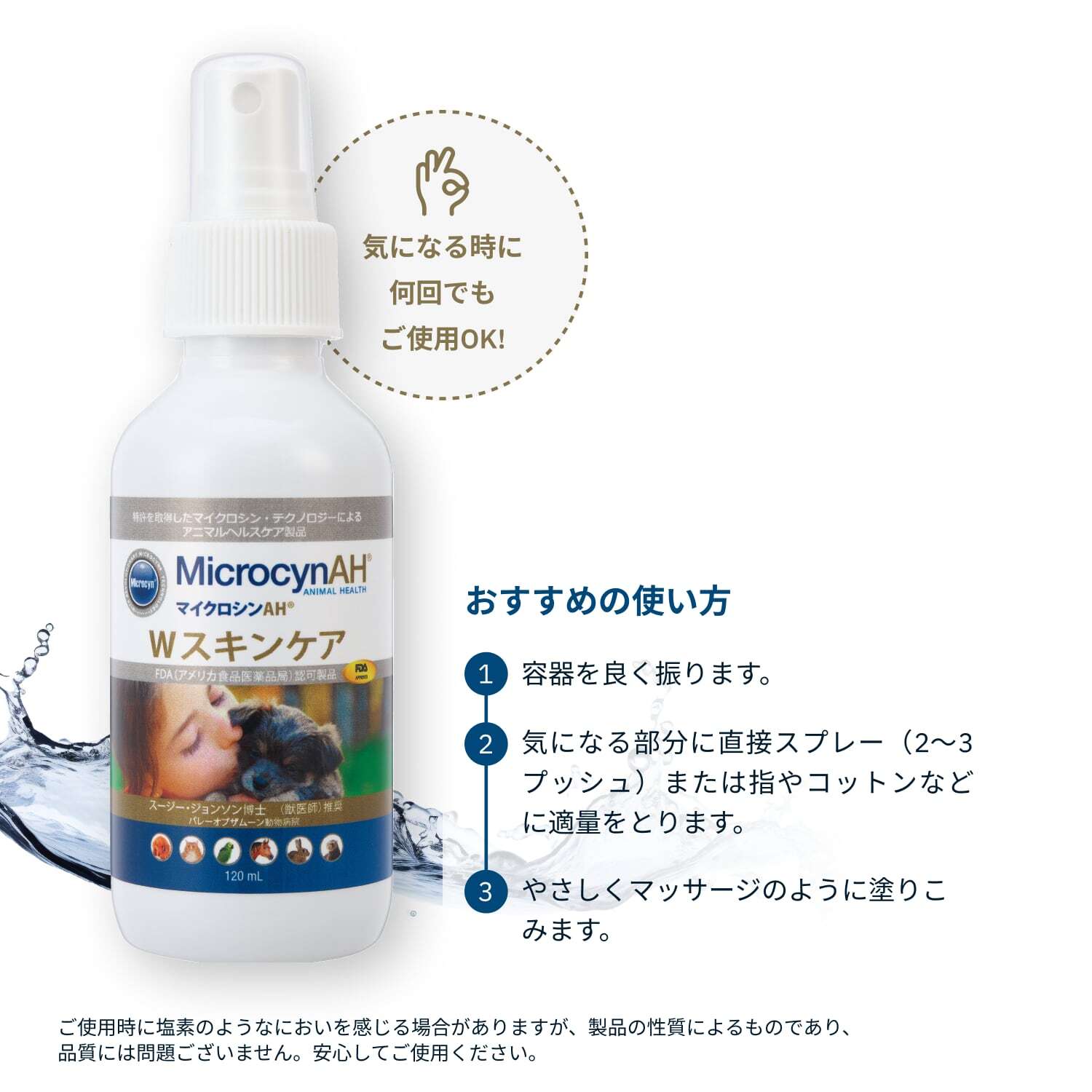 マイクロシンは、アメリカの製薬会社ソノマファーマシューティカル社が開発した、人と動物のためのヘルスケアブランドです。特許技術「マイクロシンテクノロジー」で次亜塩素酸の働きを安定化し、毎日のケアに取り入れやすい製品として実用化しました。マイクロシンAHシリーズは、体に備わる“自分を守る力(自然治癒力)”に着目し、ペットの健康をやさしく支えます。