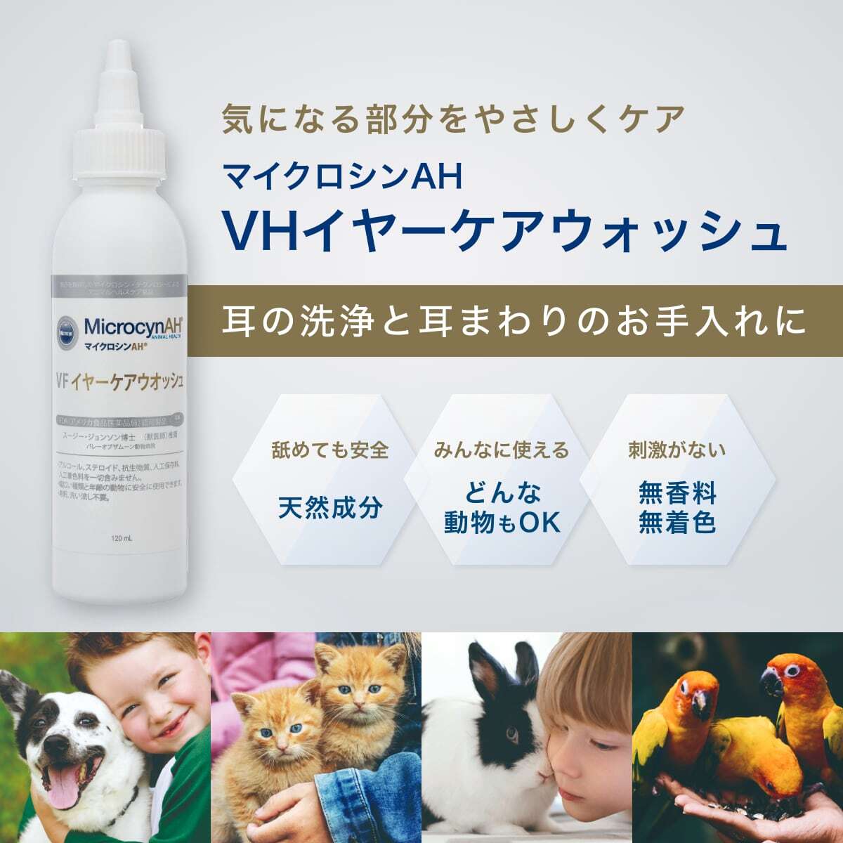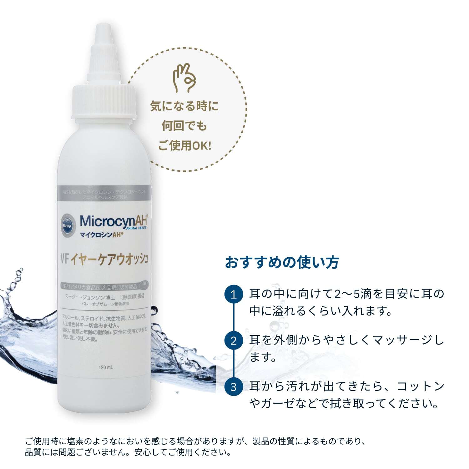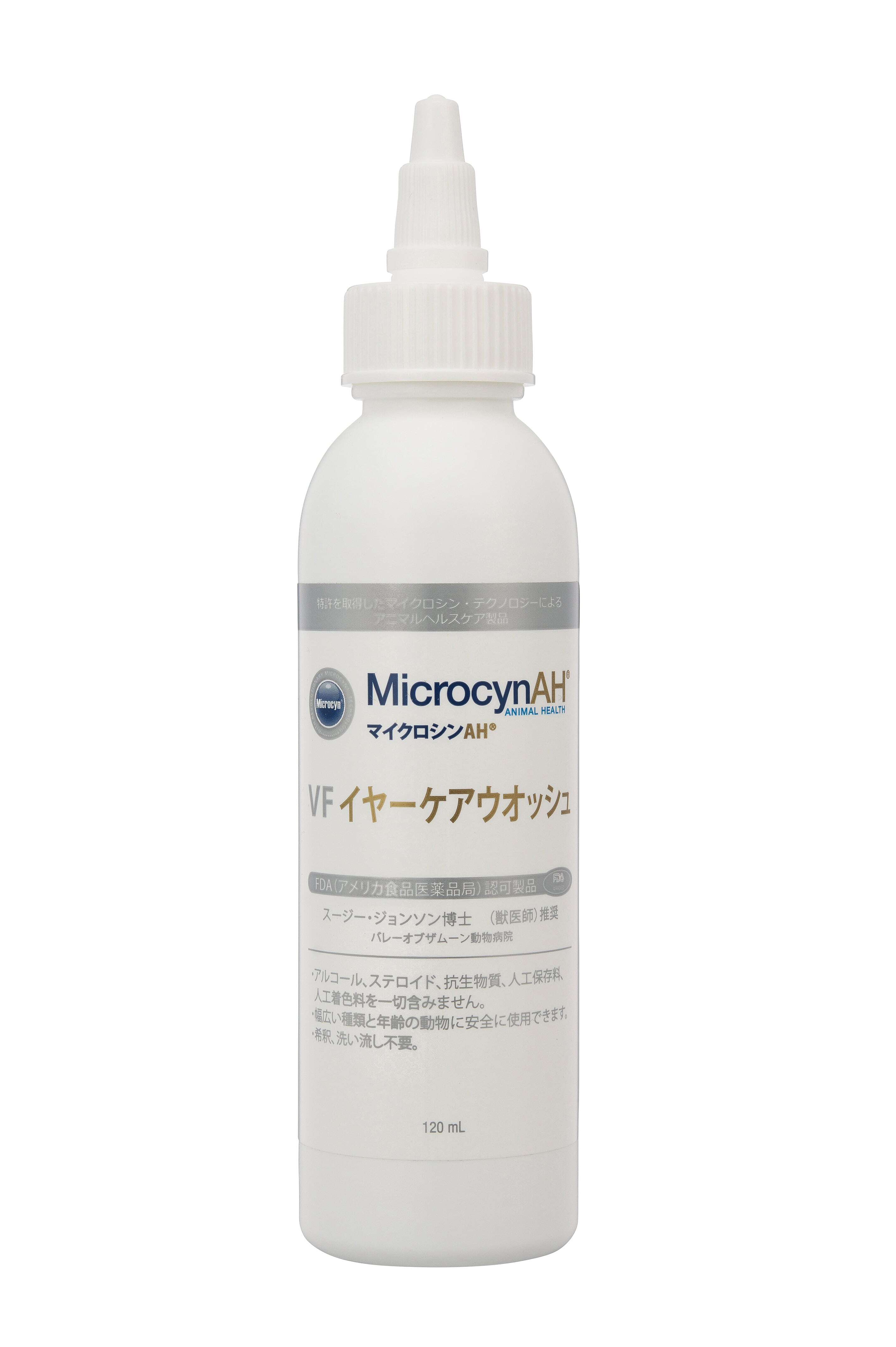 マイクロシンAH VFイヤーケアウォッシュは、耳や耳まわりのお手入れに最適です。ステロイド・抗生物質・アルコール不使用。水のような使い心地で、デリケートな耳まわりにもやさしく使えます。